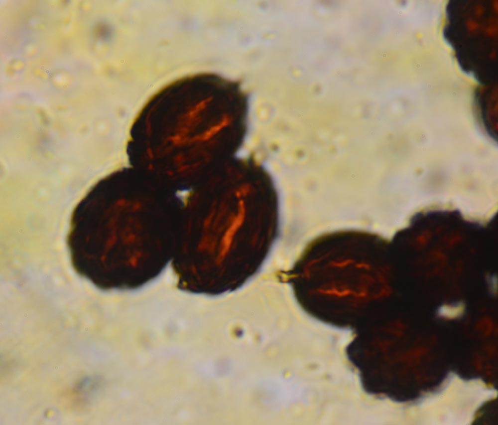 Mikromerkmale: Elliptische Sporen mit deutlichen Furchen/Längsrippen und Appendix. Dunkelbraun. Sporengröße: 14-18µm x 11-15µm.