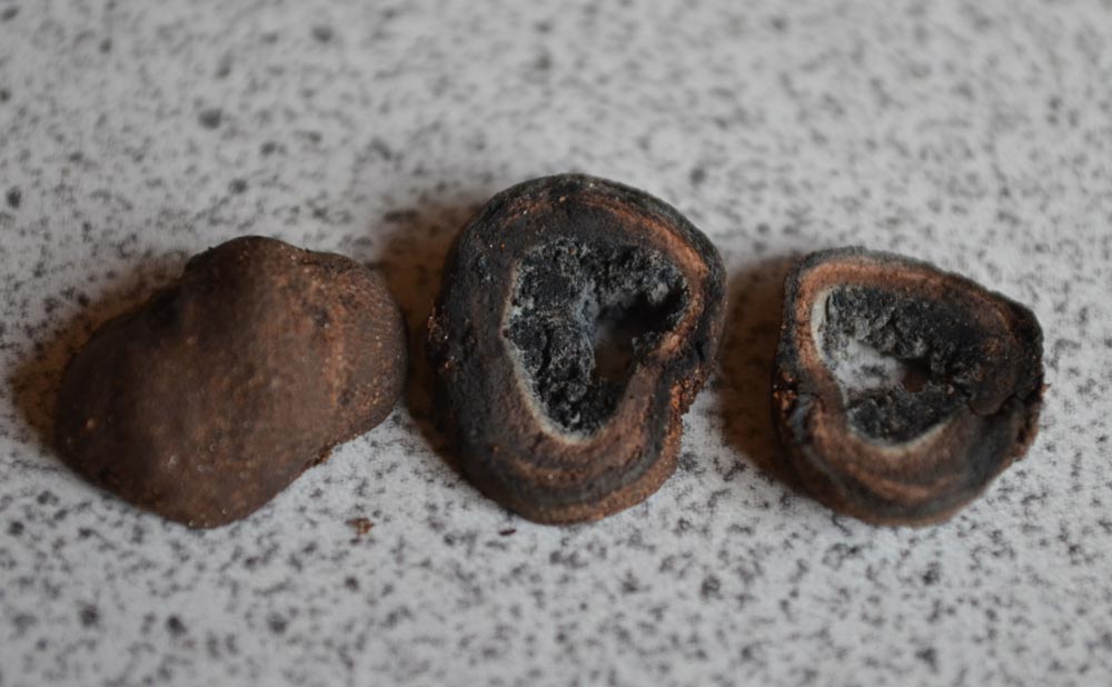Peridie: Schwarze, fein warzige Peridie. Im Schnitt weißlich/hell, mit zweiter brauner Lage weiter innen.