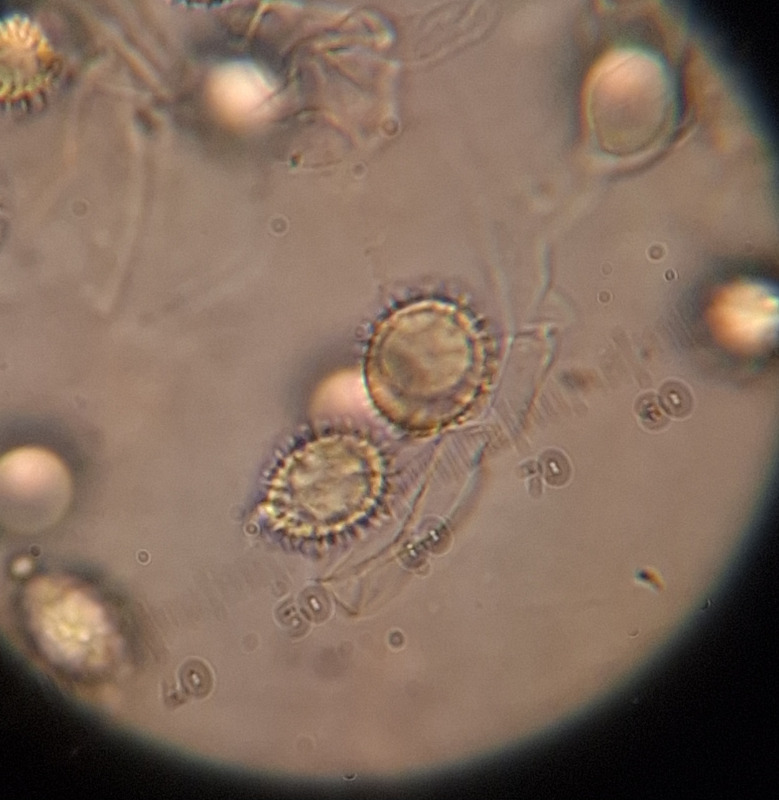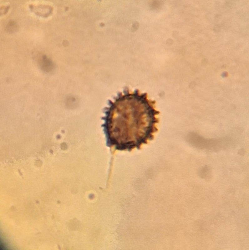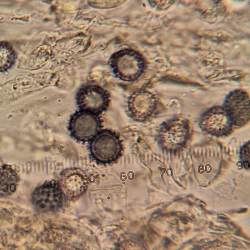 Die Sporen 8-11x7-9 µm, die Ornamente 1-1.5 µm.