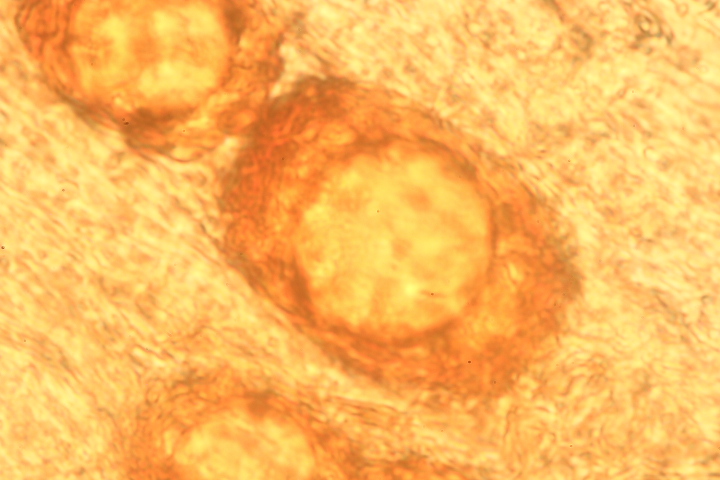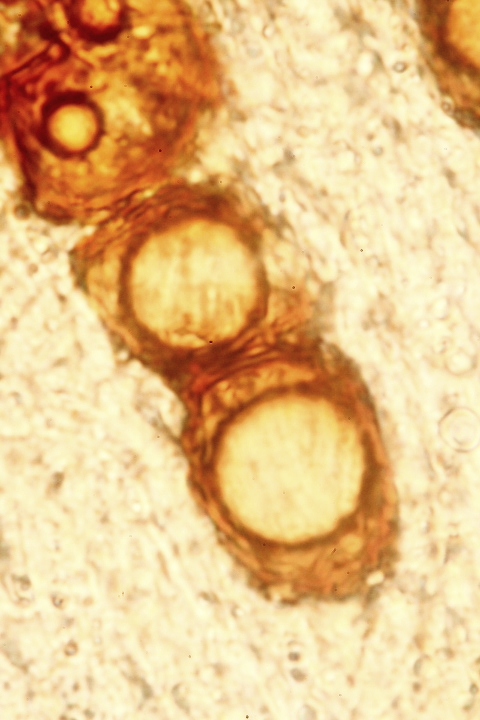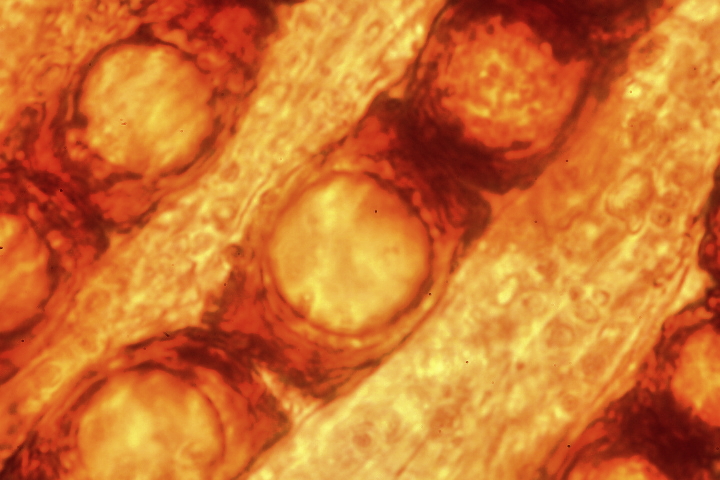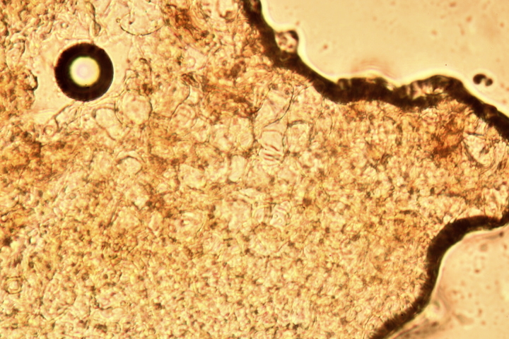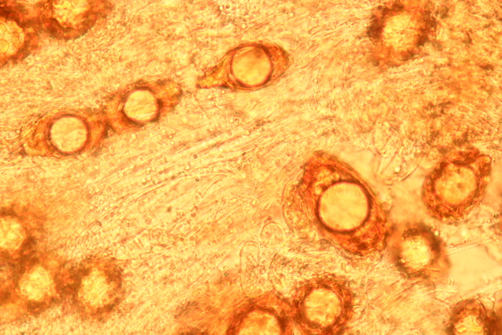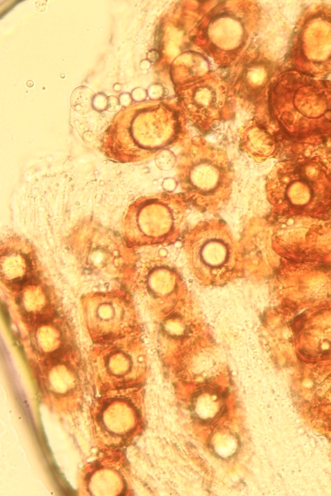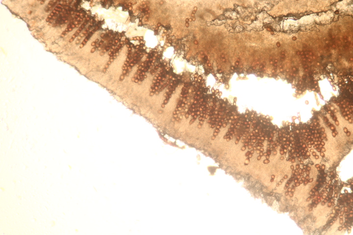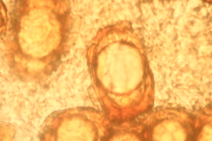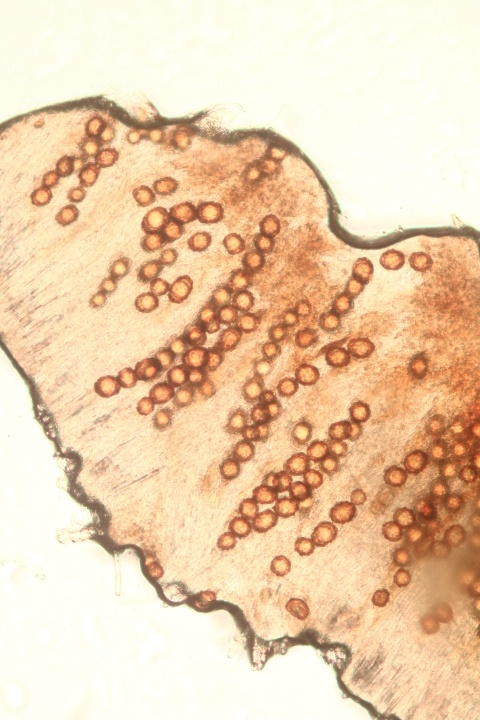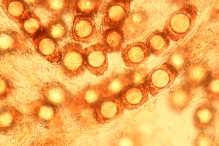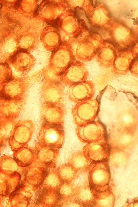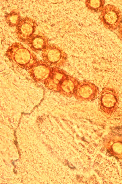 Im optischen Schnitt sind die Ornamante radial gestreift. Ich gebe zu, dass man das nur selten so schön darstellen kann. Ich habe sehr lange gesucht, bis ich passende Sporen fand, an denen man es richtig sieht.