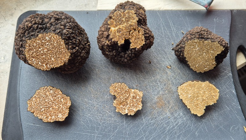 die Gerüche sind nur ein kleiner Teil bei der Beschreibung von Tuber-Arten. Deine drei abgebildeten Fruchtkörper sehen äußerlich praktisch gleich aus: Schwarze, warzige Peridie, braunes, marmoriertes Fleisch (Gleba).