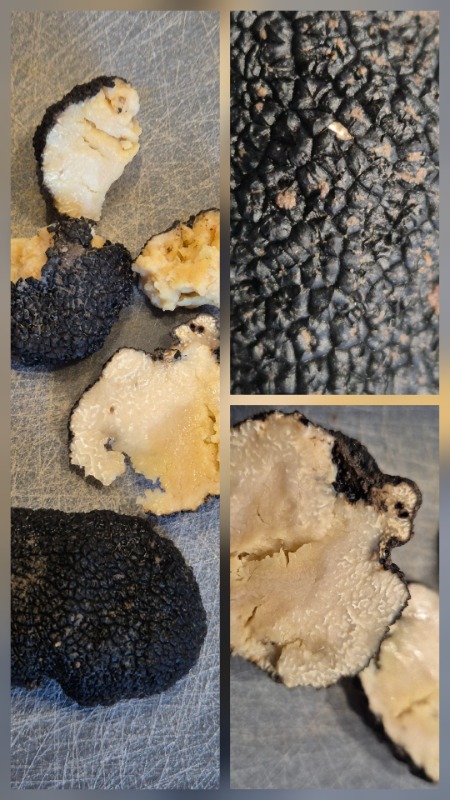 Peride schwarz mit kleinen Warzen, die Trüffel ist eher weich, lag ganz nah der Oberfläche. Hat vielleicht unter den Regenfällen der letzten Tage und dem starken Nachtfrost gelitten?