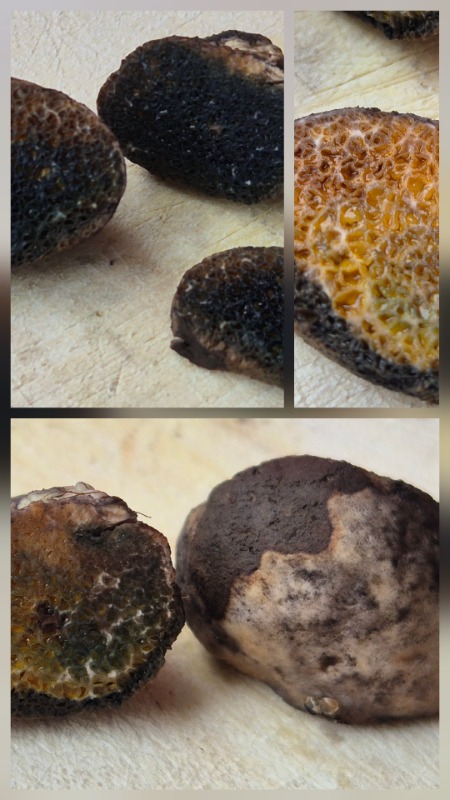 Am Fuß einer Eiche in Hanglage hat Paco eine Trüffel gefunden, die im Anschnitt schwärzt. Frisch ist die Trüffel gelblich/orange und die Peride weiß mit einer dunkelbraunen Haut überzogen und glatt.