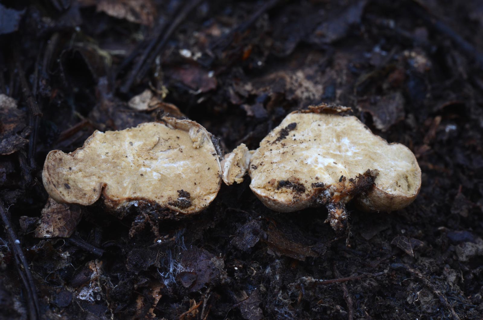 Peridie: Weiß bis beige braun, oft von Rhizomorphen umwickelt und mit Streuteilen verwachsen.